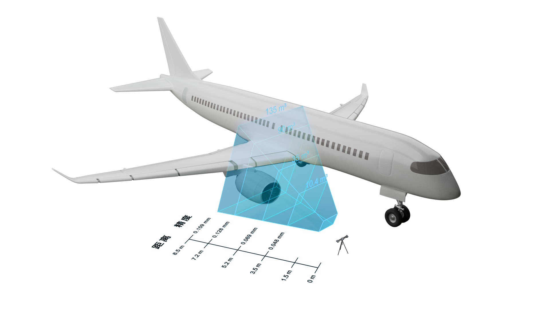 (3) TrackScan Sharp-S'nin endüstriyel sınıf yüksek hassasiyetli ölçüm aralığı 135 m³'e kadar ve tarama aralığı 233 m³'e kadardır.